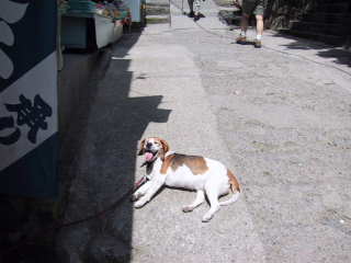 参道の犬も暑さでばて気味?